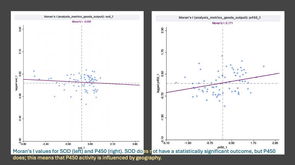 - P450 showed a few significant clusters, SOD did not. This aligns with the KW comparisons and the Spearman’s correlations results. Thank goodness.