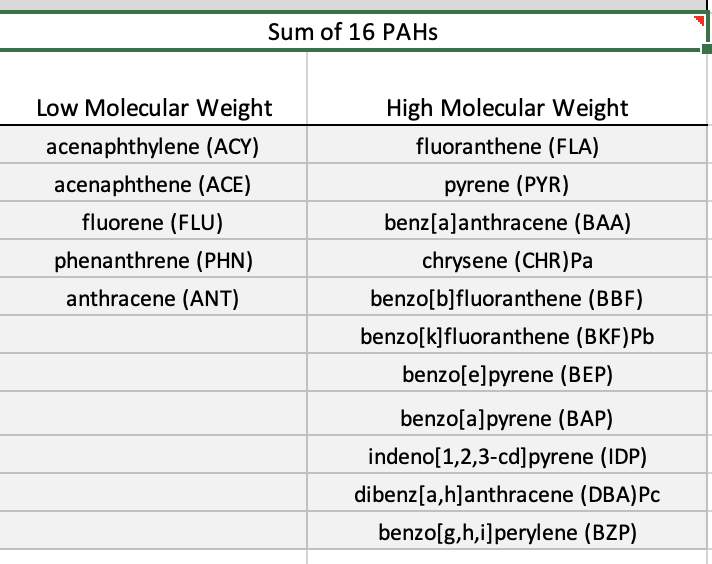 - I used the Sum of 16 PAHs because they are the longest defined PAHs by the EPA for their toxicity to humans. The lowest PAH concentration was at a site not included in the earlier work (Drayton Harbor).