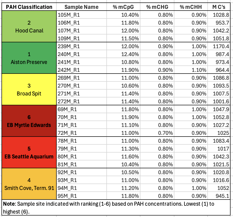 - Since I like a good list over a plot, I took the multiQC data table, added pertinent sample information and put it below. It helped me see that methylation, on average was the same across all samples - that makes the upcoming work of figuring out where that methylation is occurring very interesting.