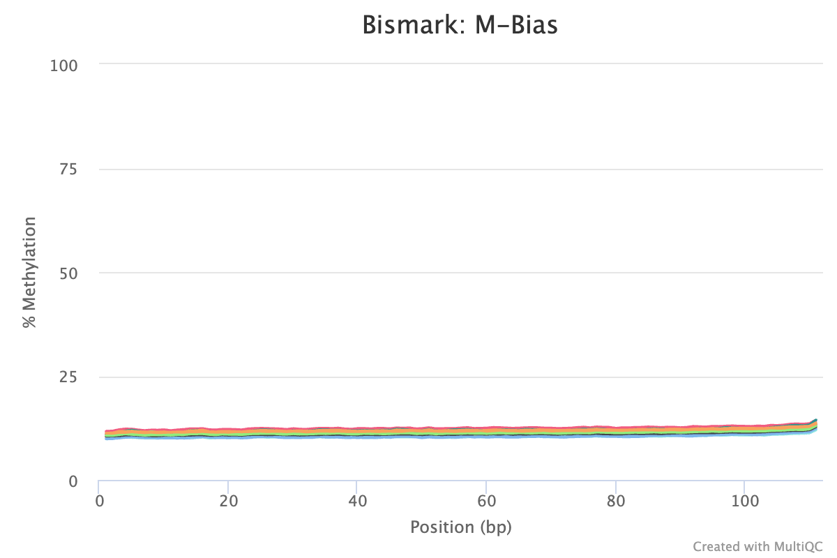 - M-Bias reports/ plots. ‘M’ethylation bias across read positions. M-bias looks at the percentage of cytosines are ’called’ methylated across every single base in the sequence. Additionally, the lack of any ‘jumps’ or ‘spikes’ in the lines indicate nothing external (non-biological) has created noise in the sequences.